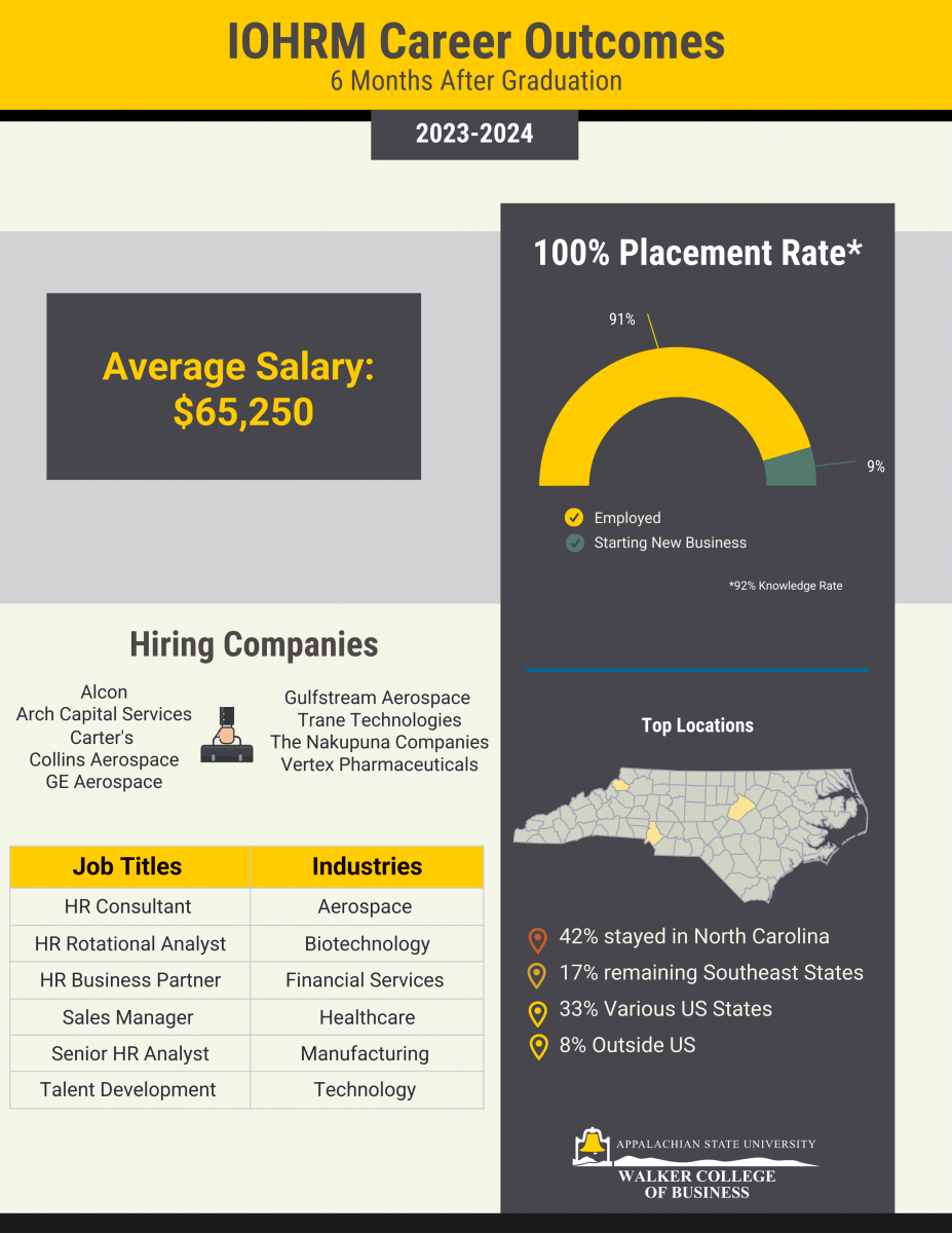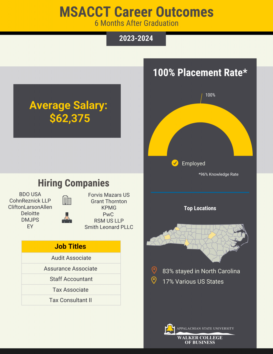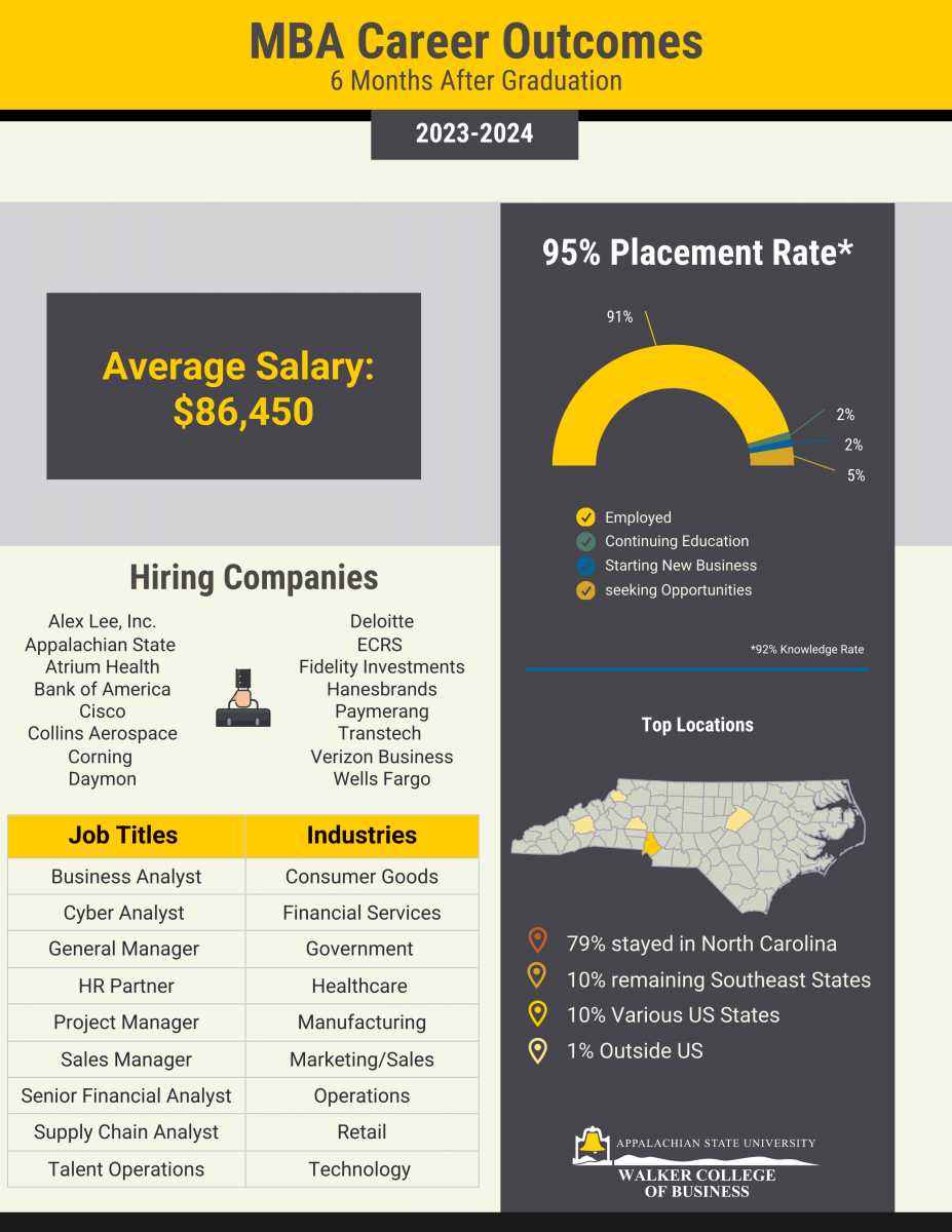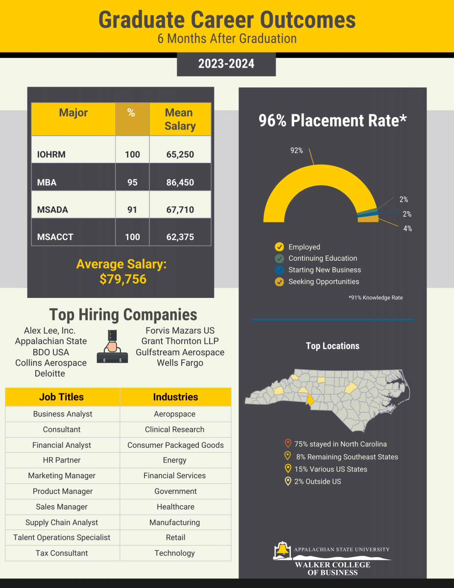 Career Destinations for 2023 – 2024 All WCOB Graduate Programs, 6 Months After Graduation. Knowledge rate: 91%. View Graduate Career Outcomes flyer.